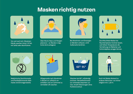 Jede Infografik präsentiert eine eindeutige und ansprechende Illustration, die den richtigen Umgang mit Masken verdeutlicht. Die Infografiken wurden so gestaltet, dass sie im Look der bisherigen AHA-Kampagne nahtlos und überzeugend ins Gesamtkonzept passen.