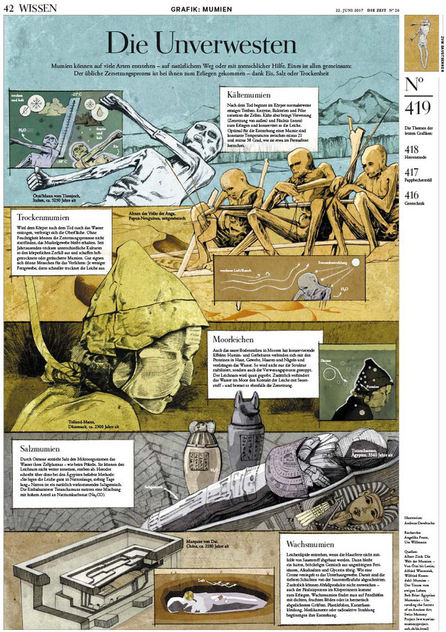 Ich hatte die Möglichkeit, für Die Zeit eine Infografik mit dem Titel "Die Unvergessenen" zu erstellen, die sich mit den verschiedenen Einbalsamierungsmethoden im Laufe der Geschichte befasst.