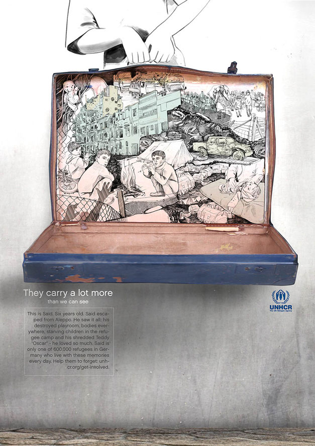 veranschaulichen, dass jeder Mensch seine eigene Geschichte mit sich trägt. In diesem Fall haben die Flüchtlinge ihre Geschichten buchstäblich in ihren Koffern gepackt.