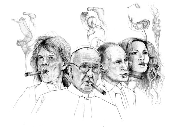 Meine Illustration zeigt vier der wichtigsten Persönlichkeiten, die während des Jahres Kuba besucht haben. Jeder von ihnen hält eine Kubanische Zigarre in der Hand. Mit Bleistift gezeichnet, ist die Zeichnung detailliert und zeigt die Persönlichkeiten in einer realistischen Darstellung.