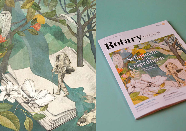 Gemeinsam mit Jana Walczyk konnten wir für das Rotary Mitgliedermagazin verschiedene Illustrationen erstellen, wie Cover-Designs, Aufmacher-Illustrationen, drei große Illustrationen, eine Buchseite und fünf Freisteller. Für die Umsetzung kombinierten wir traditionelle Bleistiftzeichnungen mit digitalen Collage-Techniken.