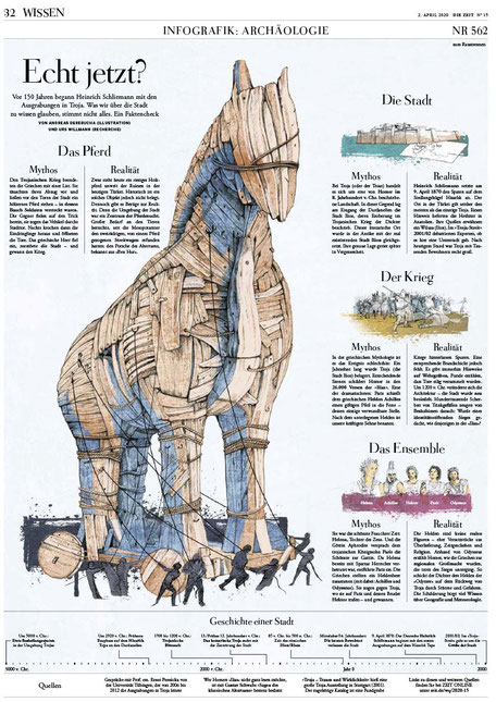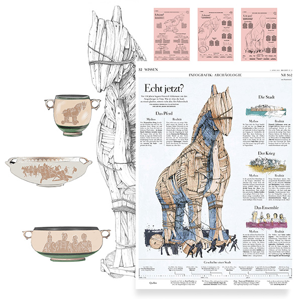 Ich hatte die Gelegenheit, eine Infografik für die Zeit zum Thema Troja zu zeichnen. Die Geschichte von Heinrich Schliemann und seiner Ausgrabung in Troja vor 150 Jahren enthüllt, dass nicht alles, was wir über die Stadt zu wissen glauben, der Wahrheit entspricht. Die Infografik ist ein Faktencheck und zeigt, was wir wirklich über die Geschichte von Troja wissen, wie sie entdeckt wurde, und welche Mythen und Legenden sich um die Stadt ranken. Zur Veranschaulichung der Fakten wurden klare Linien, ansprechende Farben und aussagekräftige Icons verwendet.