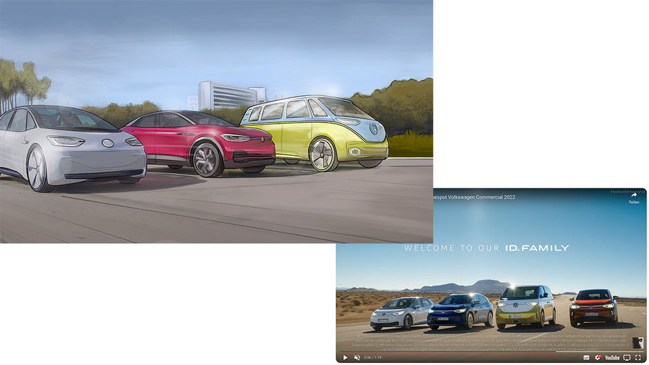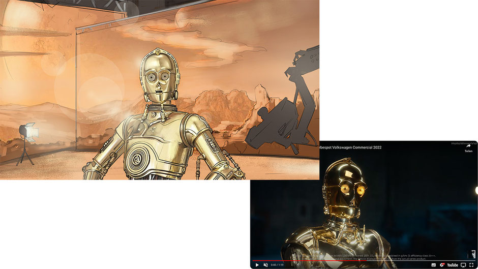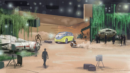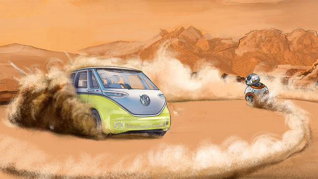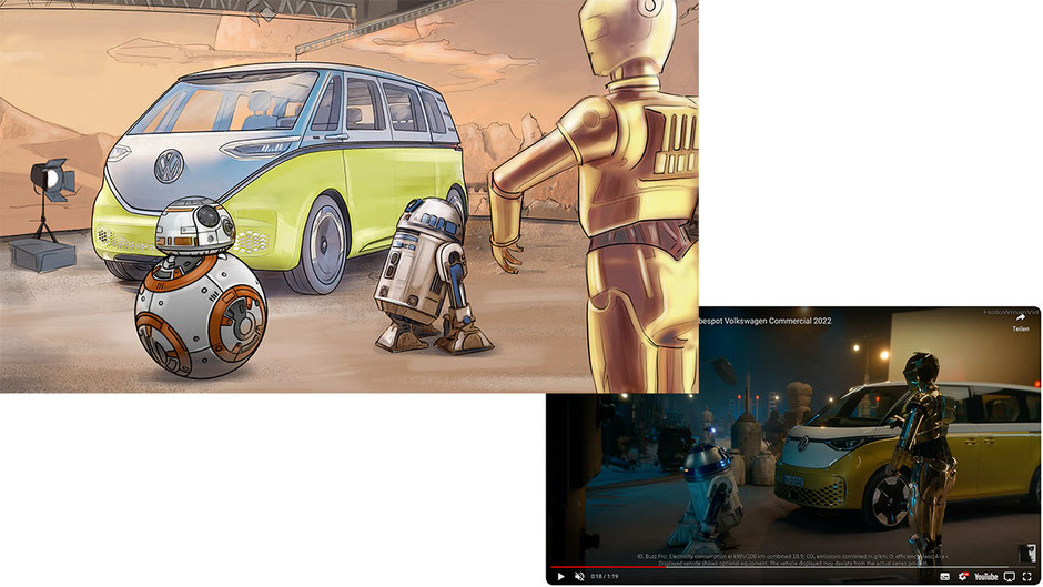 Ich hatte die unglaubliche Chance, als Storyboard-Künstler für VW BUZZ an einem ganz besonderen Projekt zu arbeiten - einer Werbekampagne, die das Thema Star Wars integriert. Es war eine Herausforderung, die visuellen Elemente von Star Wars und gleichzeitig die Markenbotschaft und -ästhetik von VW BUZZ zu berücksichtigen. Ich war jedoch sehr begeistert von der Gelegenheit, meine kreativen Fähigkeiten auf diese Weise einbringen zu können. Als Künstler war es eine wahre Freude, an einem Projekt zu arbeiten, das meine eigene Leidenschaft für Star Wars mit meiner beruflichen Tätigkeit verbindet. Ich bin sehr zufrieden mit dem Ergebnis und dass ich dazu beitragen konnte, diese coole und einzigartige Werbekampagne für VW BUZZ erschaffen zu haben. Als besonderes Highlight wurde der Werbefilm in Hollywood gedreht.