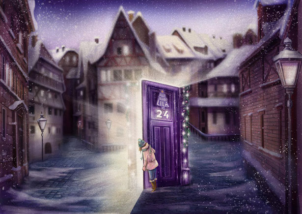 Durch die mystische Tür und das kleine Kind, das hindurchschaut, wird der Betrachter dazu eingeladen, eine Welt voller Wunder und Geheimnisse zu betreten. Die weihnachtliche Stimmung und die Farben verstärken dieses Gefühl und schaffen eine Verbindung zur Festtagssaison.